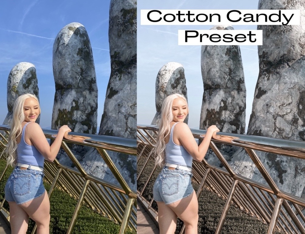 "Cotton Candy Preset" creates a light, rosy monochromatic theme to your photos. If you want to create a cohesive feed, without spending a ton of time editing your photos or figuring out an aesthetic, this preset will transform your photos so they're ready to post in just one click! It's best used on daytime photos taken outside but also works well on indoor photos with natural lighting!